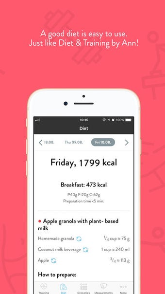 Diet & Training by Ann to aplikacja na iPhone'a opracowana przez DietLabs Sp. z o. o., która oferuje kompleksowe podejście do zdrowego stylu życia. Ta aplikacja lifestyle'u zapewnia łatwe treningi domowe z elementami sztuk walki, ćwiczeń oddechowych i funkcji równowagi, co pomaga wprowadzić kompleksowe zmiany w stylu życia. Aplikacja oferuje również cztery łatwe diety, w tym wegetariańską dietę, oraz ponad 90 planów treningowych. Treningi są dostępne dla różnych grup, w tym dla kobiet, mężczyzn, par, każdego trymestru ciąży, młodych matek, biegaczy, osób prowadzących biurowy tryb życia, praktykujących jogę i osób powyżej 50 roku życia. Dzięki instrukcjom głosowym krok po kroku, specjalnym treningom spalającym tłuszcz oraz prostym treningom dla początkujących i trudnym treningom dla bardziej zaawansowanych, Diet & Training by Ann to doskonały osobisty dietetyk i ekspert fitness.